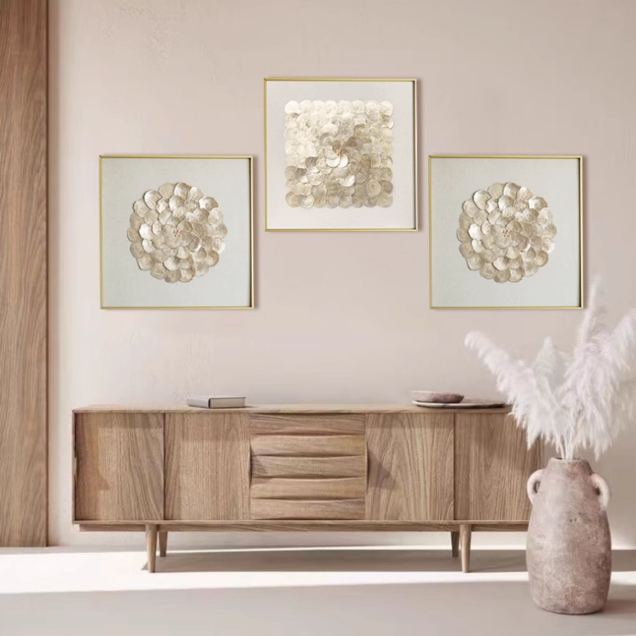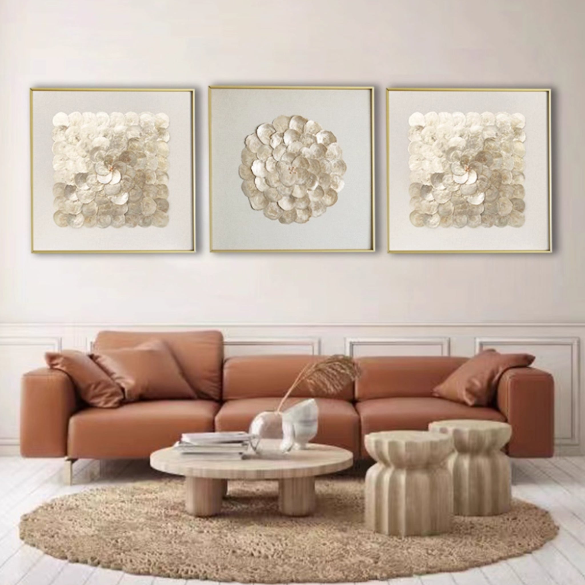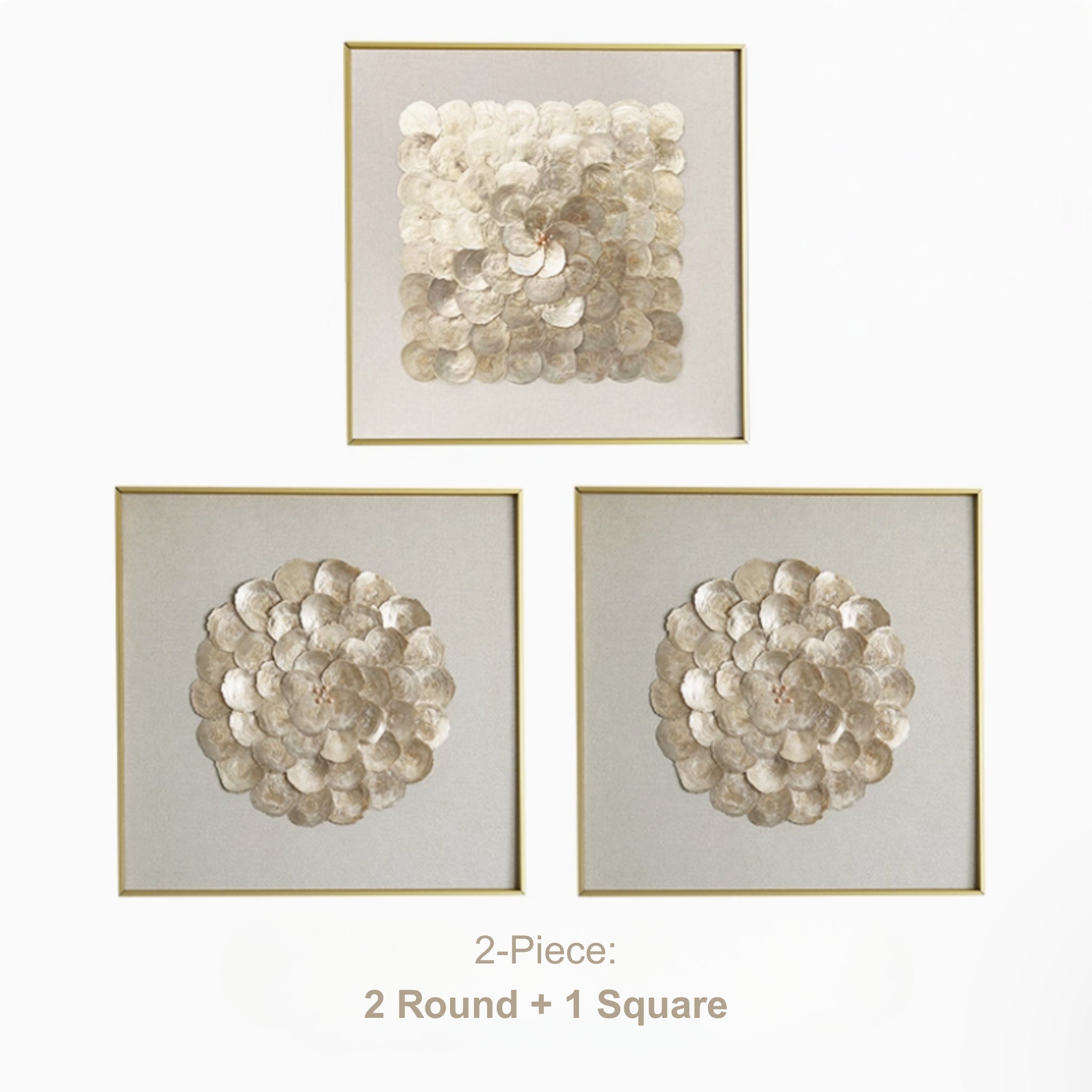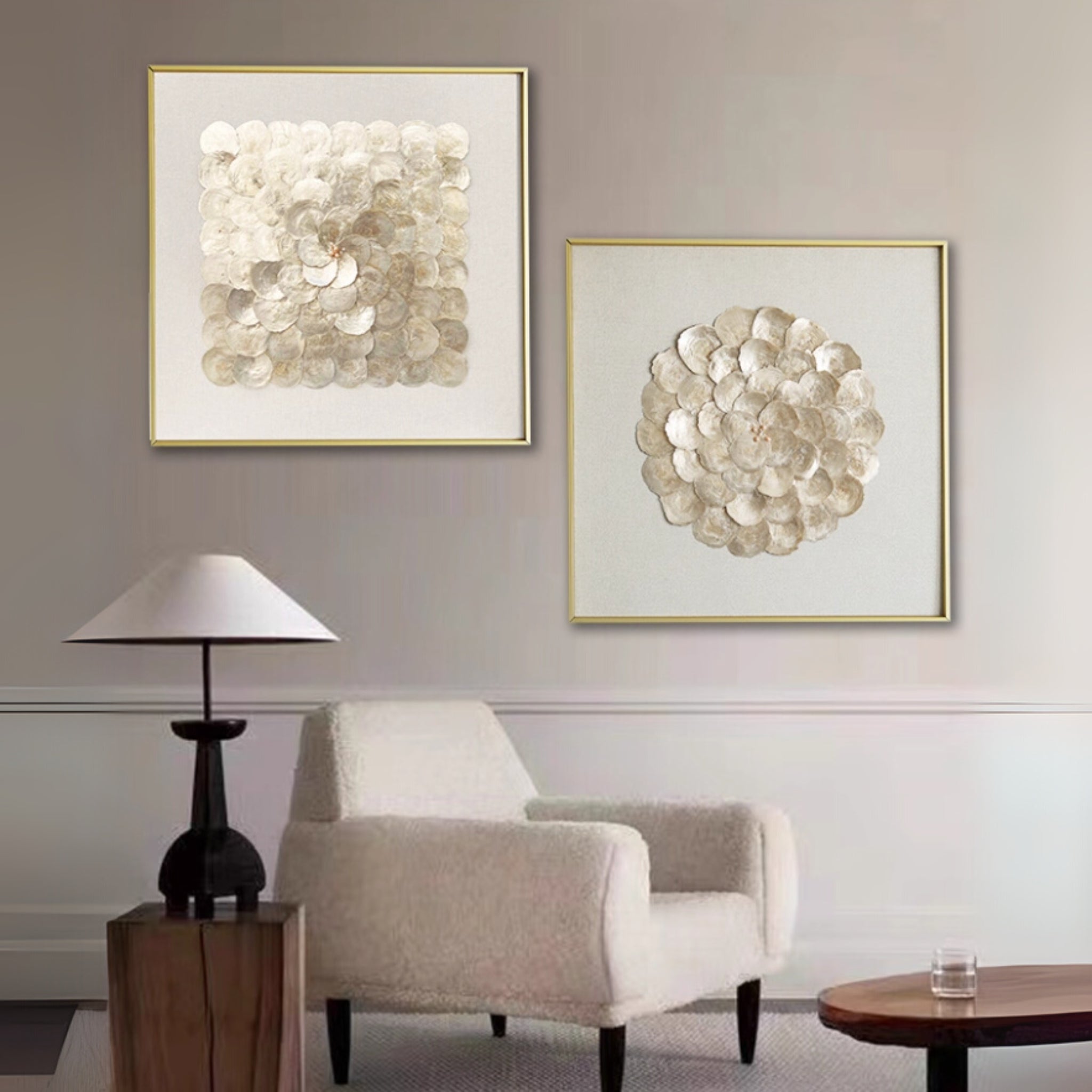 Adorn your walls with the serene beauty and intricate artistry of our Luxury 3D Handcrafted Natural Shell Mosaic Art. This exquisite set features two elegant square framed pieces, each meticulously crafted with genuine natural shells to create unique, dimensional mosaic patterns. Evoking the tranquil allure of the coast, the delicate textures and organic forms shimmer subtly, bringing a sophisticated, coastal-inspired elegance to your home. Perfect for a living room, bedroom, or entryway, this art set is a beautiful celebration of nature's artistry and skilled craftsmanship, offering a unique focal point that elevates any interior.