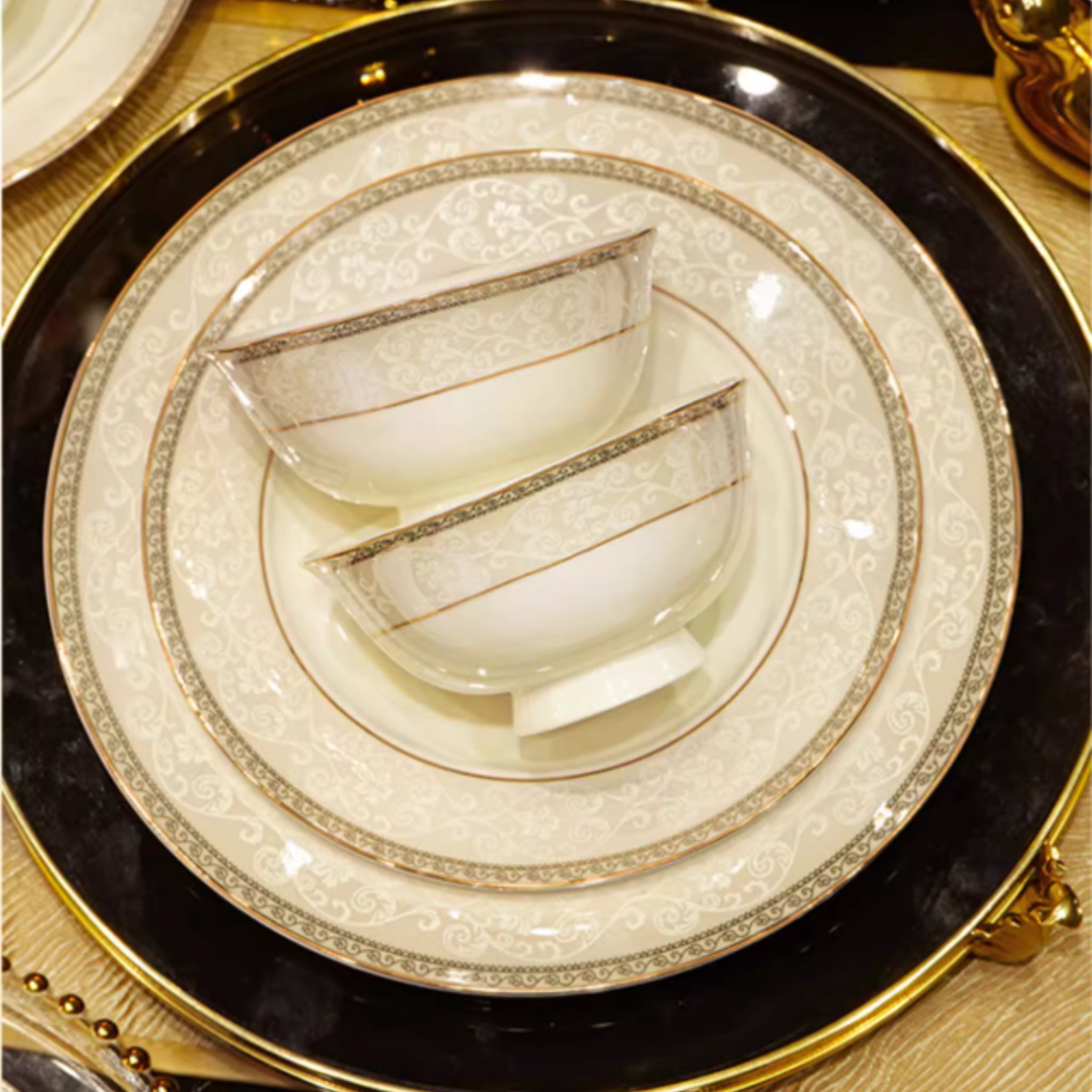 Dine like royalty with our Opulent Gold Rimmed Dinnerware Set. This magnificent collection redefines luxurious dining, featuring exquisite pieces crafted from premium porcelain with lavish, intricate gold-rimmed detailing and subtle embossed patterns. Evoking a grand, royal style, this tableware set is designed to make every meal a majestic event. Perfect for weddings, anniversaries, formal gatherings, or simply creating an unparalleled dining experience, it promises to be the centerpiece of your most cherished celebrations.