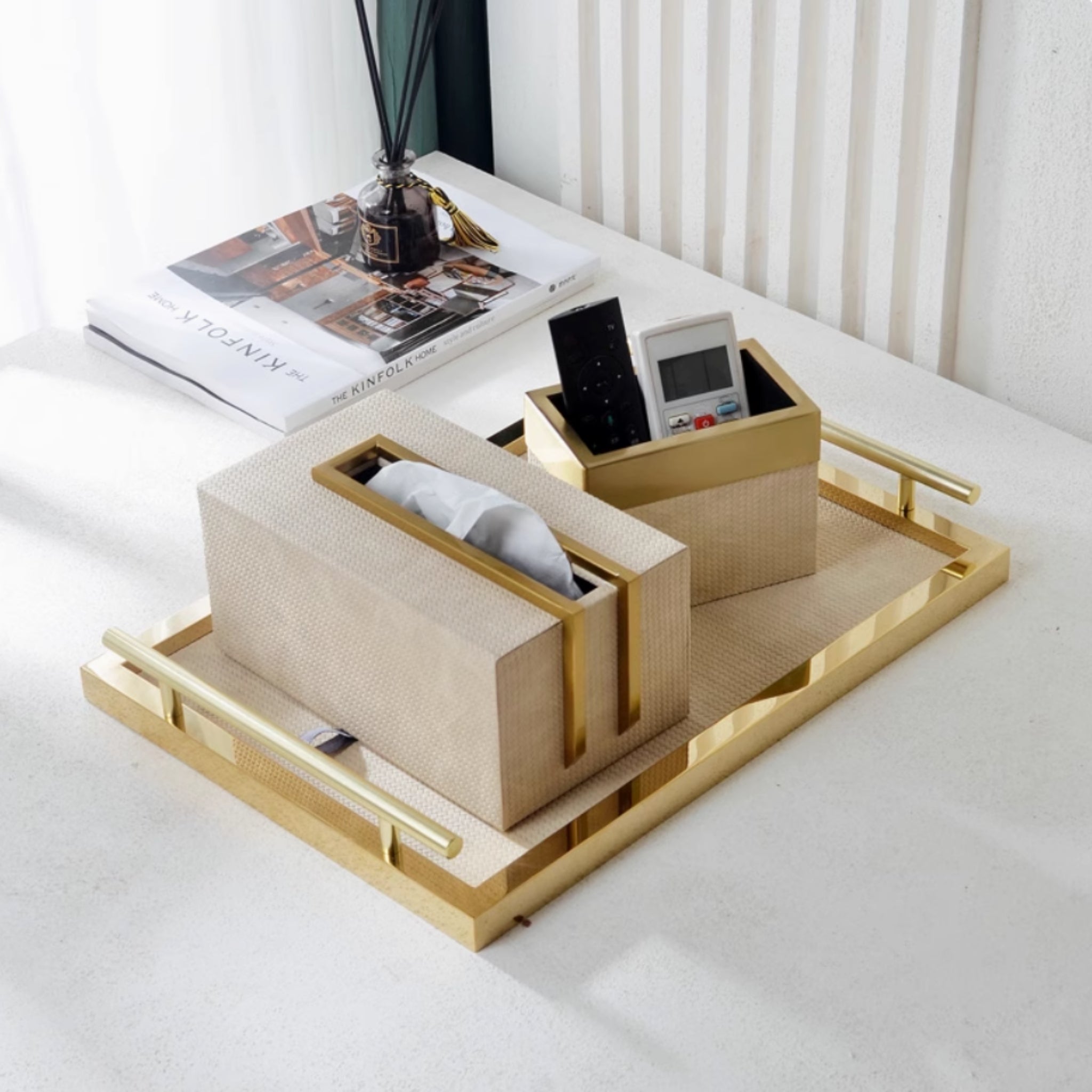 Elevate your workspace or vanity with the sophisticated organization of our Luxury Beige Leather Desk Organizer Tray Set. This exquisite set combines practical storage with refined design, crafted from premium beige leather and accented with a radiant golden iron edge. The multi-compartment tray, along with its integrated tissue box holder and remote caddy, ensures all your essentials—from stationery to media remotes and tissues—are neatly arranged and beautifully presented. It’s a perfect blend of functionality and elegance, adding a touch of luxury to any desk, coffee table, or nightstand.